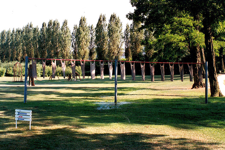 Het thema van de expositie in Borculo was water. Zo werden hagelwitte hemden besproeid door opgepompt Berkelwater.